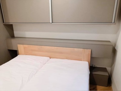 Dále zde můžete vidět designové krytí za čelem postele s odkládacími prostory a knihovnu s posuvnými dveřmi, tak aby vše tvořilo kompaktní celek.